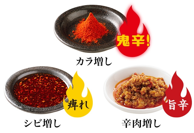 激辛好きに是非チャレンジしてほしいトッピングをご用意しました。カラ増し3袋と、シビ増し1皿を組み合わせた「鬼辛えんま」は、「野菜麻辣らーめん」、「麻辣唐麺」にトッピングをしてお楽しみください。