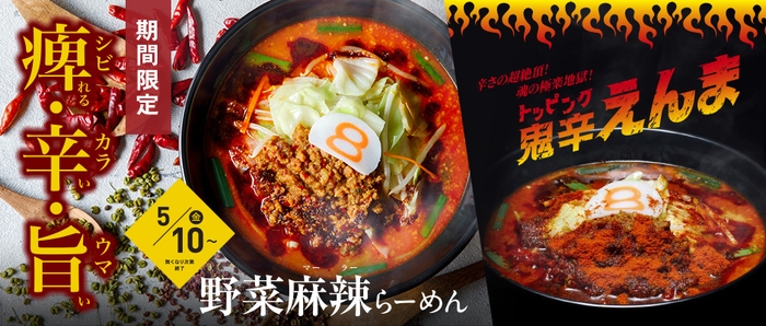 株式会社ハチバン(本社:石川県金沢市、代表取締役社長: 長丸 昌功)が展開するラーメンチェーン「8番らーめん」では、今年で発売6年目になる人気のシビカラがクセになる麻辣メニュー2品を5月10日(金)から順次、期間限定で発売します。今年は激辛トッピング「鬼辛えんま」が新登場!辛さの超絶頂を体験してください。