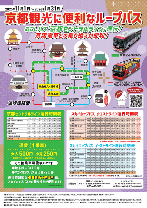京阪バス株式会社(本社:京都市、社長:三浦達也)では、オーバーツーリズムによる京都市内の公共交通機関の混雑及び京都駅への一極集中の緩和に寄与することを目的に、11月1日(土)より三条京阪を起点とした京都市内観光循環バスを期間限定で実証運行いたします。