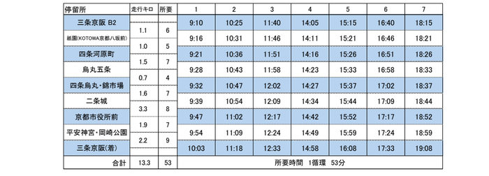 三条京阪B2乗り場[S1] 祇園(KOTOWA京都八坂前)[S2] 四条河原町[S3] 烏丸五条[S4] 四条烏丸・錦市場[S5] 二条城[S6] 京都市役所前[S7] 平安神宮・岡崎公園[S8]