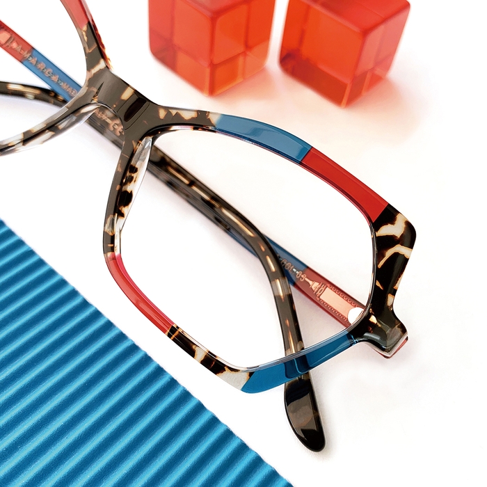 アセテート生地を裁断し、繋ぎ合わせたオリジナルの生地や職人の手による独特のカッティングなど、その手法と技術はファクトリーブランドならでは。彩り豊かなアセテート生地がまるでジュエリーのような煌めきを放ちます。