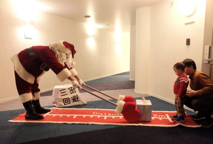 イベント期間中、サンタクロースが客室にプレゼントを届けるサービス「デリバリーサンタ」を実施します。今年はコロナ対策を徹底したサンタクロースが登場。サンタクロースと子どもが立つ位置を示した「ディスタンスカーペット」を使って2メートルの距離を保ち、密接を回避します。プレゼントは大きなサンタの手をイメージした「ディスタンスハンド」で渡します。さらに、飛沫感染対策として、サンタクロースは花火柄のマスクを着用します。