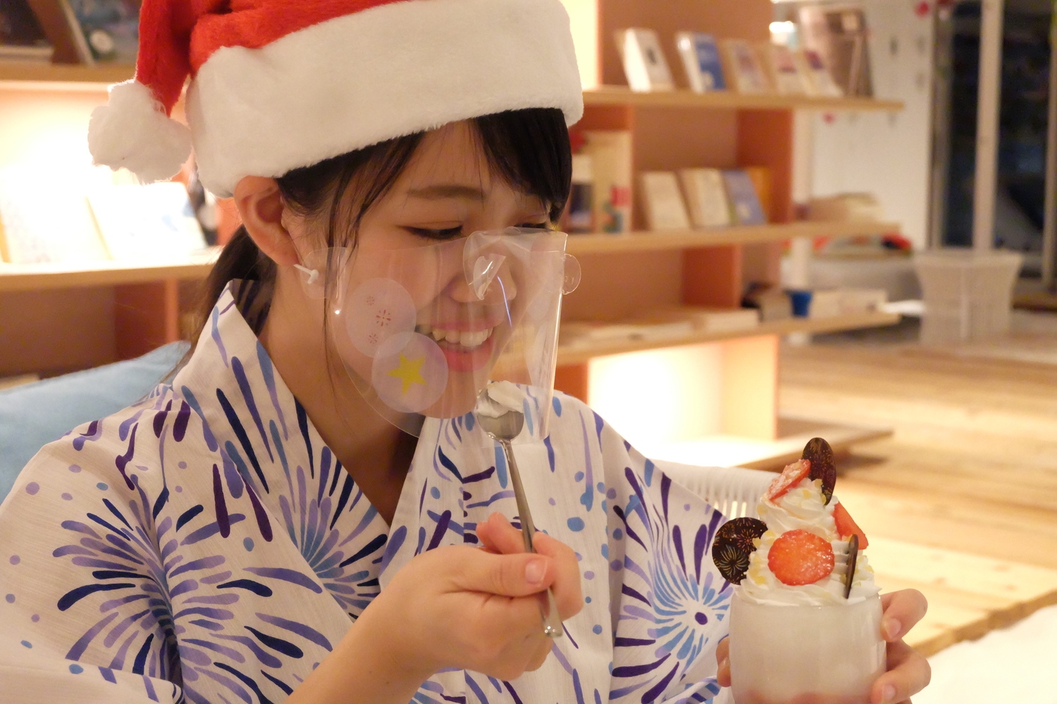 2 食事用マスクを着用して花火クリスマスパフェを味わう