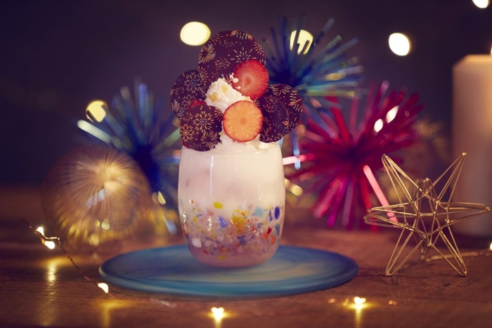 ホテル最上階にある「ソラノビーチ Books&Cafe」では、本イベント限定のスイーツ「花火クリスマスパフェ」を販売します。いちごのスライスと、花火柄のチョコレートをパフェ上部に飾り付け、花火が打ちあがっている様子を表現したパフェです。購入時には、着用したまま食事ができるマスクをお渡しするので、安心して味わうことができます。