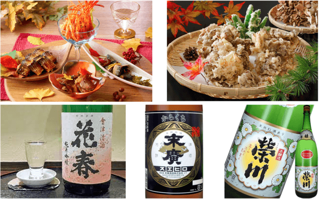 そして、福島と言えばやっぱり日本酒。地元・会津の地酒に合わせてお楽しみいただきたい、絵画のように美しい【秋の吹き寄せ】や、秋の山の恵み、【舞茸の天ぷら】。