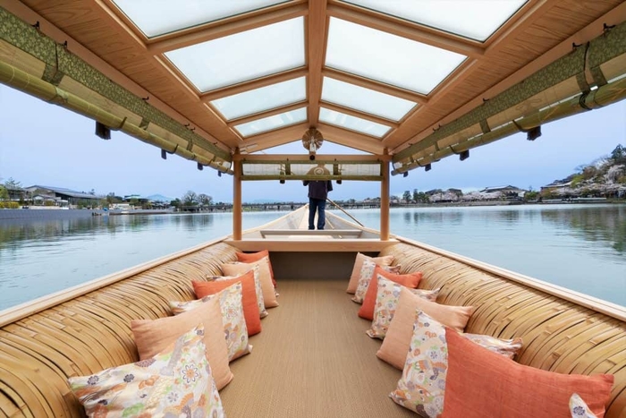 平安貴族が興じた嵐山にたたずむ水辺の私邸で時を忘れる。渡月橋から船に乗り、大堰川を遡った先では、京都に息づく日本の伝統技法を感じる客室、嵐山の情景を映した滋味豊かな日本料理、四季の美しい景観と静けさの非日常が提供されます。