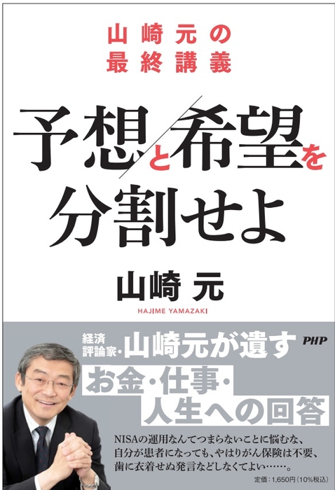 株式会社PHP研究所(京都市南区・代表取締役社長 瀬津要)は、2024年2月22日に『山崎元の最終講義 予想と希望を分割せよ』(山崎元著/税込1,650円)を発売します。著者の山崎氏は、本年1月1日に食道がんで亡くなりました(享年65)。本書は、山崎氏と20年来の付き合いになる担当編集者が、山崎氏から託された、がん発病後に発表したオンライン記事や動画内容をまとめたものです。刊行告知の段階から大きな話題となり、書店からの注文が殺到したため、発売前の重版が決定した注目の一冊です。