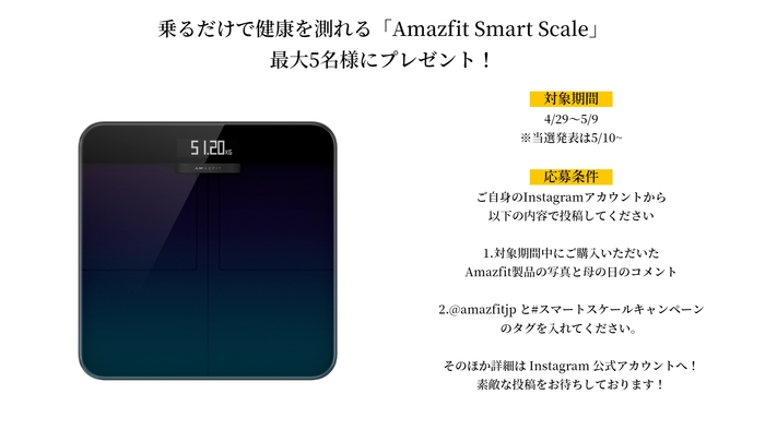 Amazfit.jp は23日に発売された新商品「Smart Scale」のプレゼントキャンペーンを Instagram 公式アカウントで実施いたします。このプレゼントキャンペーンは、Amazfit の各ネットストアで開催中の母の日セールと、Amazfit.jp の Instagram 公式アカウントが連動した企画です。