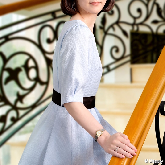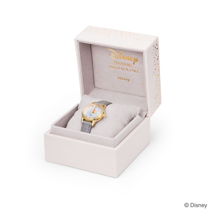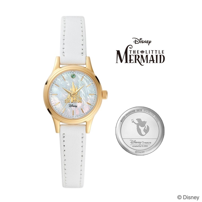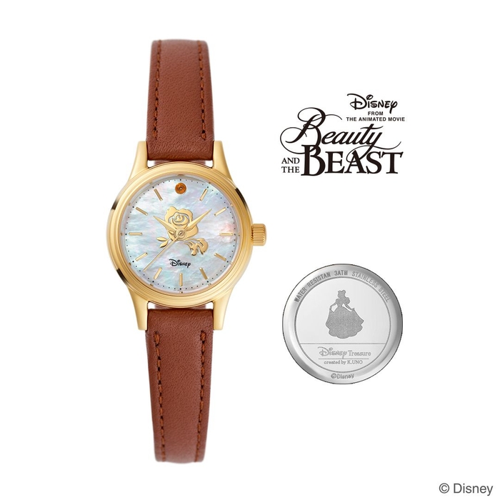 文字盤の白蝶貝と天然石のきらめきが上質な印象を添える、大人のためのディズニーデザインウォッチ。作品を象徴するモチーフや、天然石&ベルトの配色でそれぞれのディズニープリンセスの世界観を繊細に表現しています。
