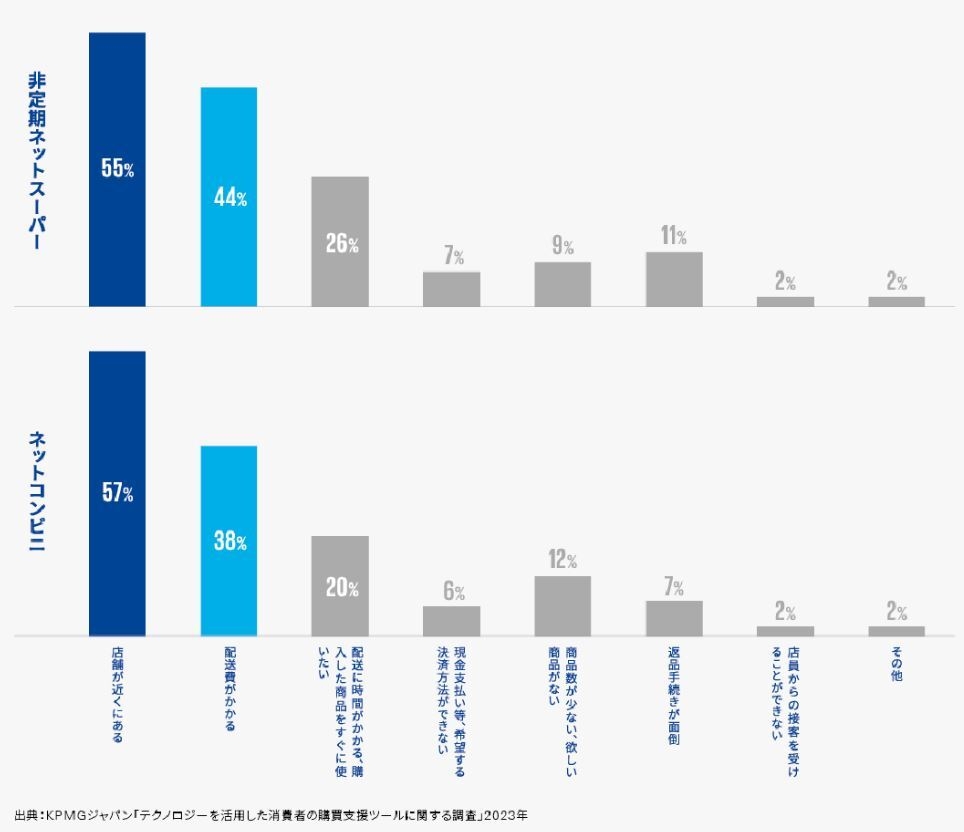 一方、今回の調査では、消費者のネットスーパー・ネットコンビニの利用経験は3割に達しませんでした(各29%、9%)。利用しない理由では、「店舗が近くにある」が最多で、次いで「配送費がかかる」が続きました(図3)。