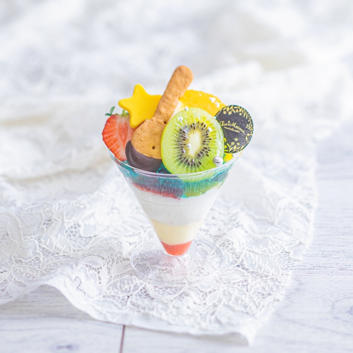 さっぱりとしたヨーグルトムースに、爽やかなプルーライチジュレを重ねました。たっぷりのフルーツとスターチョコを飾った七夕限定デザート。