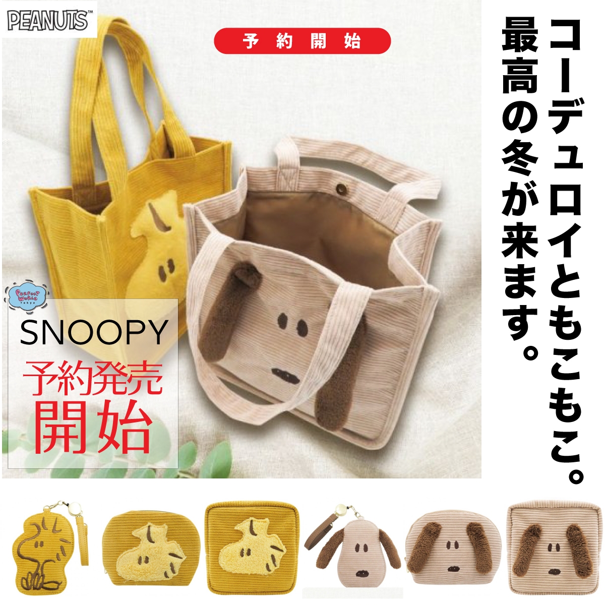予約中で先取り♫スヌーピー新シリーズは秋冬にピッタリなコーデュロイ素材♪ほっこりカラーのバッグやポーチが勢揃い
