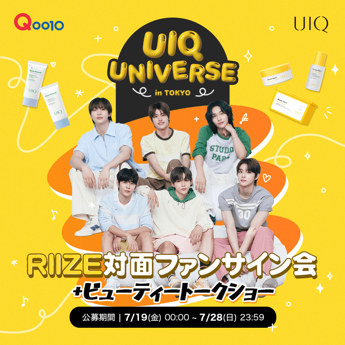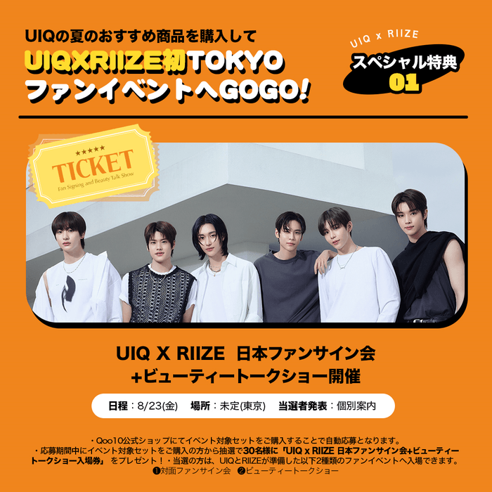 今回の「UIQ」X「RIIZE」のファンイベントへの参加方法としては、インターネット総合ショッピングモール「Qoo10」と「楽天市場」でUIQの商品をお買い求め頂いた方に応募権が与えられ、抽選で当選した方にファンイベントの入場券がプレゼントされます。ファンイベントではRIIZEによるファンイベントに加え、ビューティートークショーも開催いたします。