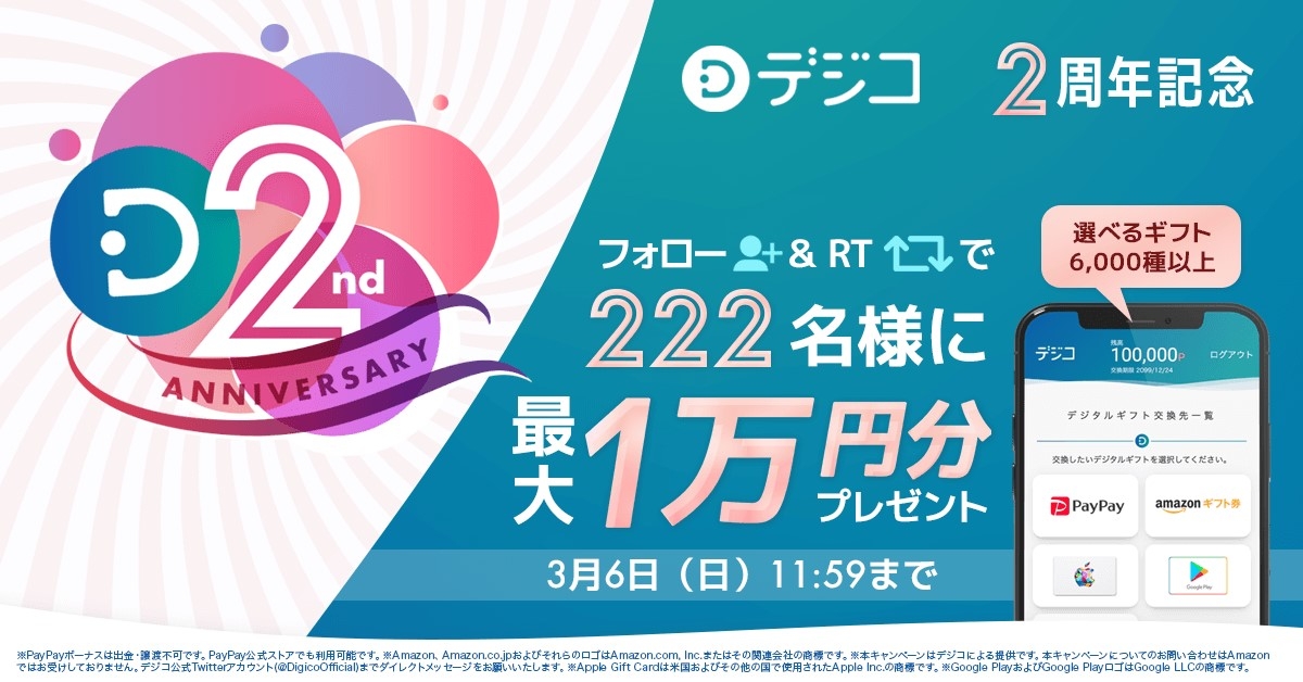 株式会社CARTA HOLDINGSのグループ会社で、マーケティングソリューション事業を展開する株式会社DIGITALIO (東京都渋谷区、代表取締役:古谷 和幸)が運営するデジタルギフト「デジコ」(https://digi-co.net/)は、2020年2月26日に旧サービス「ギフピー」から「デジコ」へ名称変更してから2周年を迎えます。日頃のご愛顧を感謝して2022年2月26日(土)より、222名様に最大1万円相当のデジコが当たる「デジコ2周年記念Twitterキャンペーン」を実施いたします。
