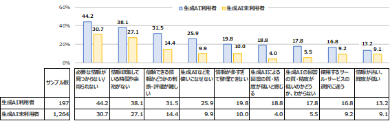 そして、生成AIの利用者ほどこうした情報収集における課題を強く認識している傾向にあり、「必要な情報が見つからない/得られない」は全体より11.7pt高い44.2%に上っている。