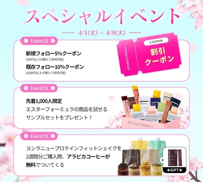 このたび2025年4月1日(火)から4月8日(火)まで開催されるQoo10メガポに参加が決定しました。今回のメガポでは新規・既存フォロークーポン、先着1000名様に贈呈するサンプルセット、新登場したヨンラニュープロテインシェイク発売記念イベントやメガポ限定セールなど豪華イベントを実施いたしますのでこの機会を見逃しなく!