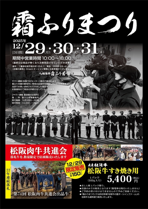 三重県松阪市の精肉店 霜ふり本舗では、2025年12月29日・30日・31日の3日間(期間中の営業時間 10時~18時)、名産松阪牛「2025 霜ふりまつり」を開催いたします。
