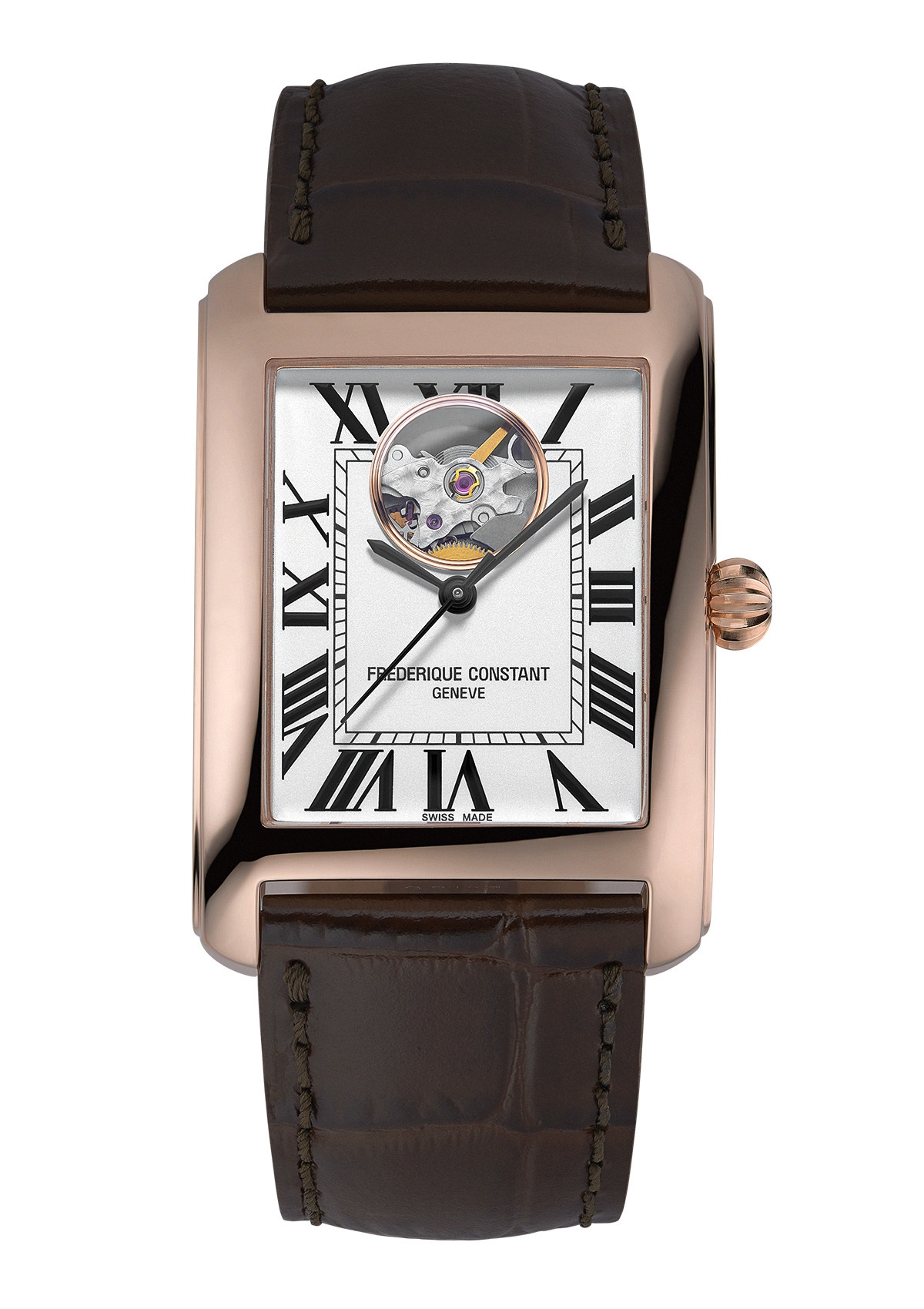 文字盤の小窓から機械式時計のテンプの動きを見せる“ハートビート”搭載のクラシックな角型“カレ”コレクション。緩やかにカーブするケースは腕にフィットし、ローマンインデックス、ケースデザインに合わせたレイルウェイデザイン、そしてオニオンリューズ。クラシカルエレガントなデザインがどのシーンでも自信を持って身につけていただける上品な一本です。