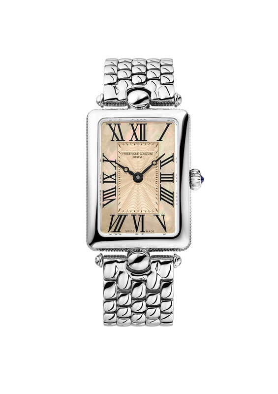 2005年に誕生したフレデリック・コンスタントのクラシック アールデココレクションのレクタンギュラーケースモデル。連続的な波模様のギョーシェ装飾の周囲にはマザーオブパールを配し、ブレゲ針やローマンインデックス、そしてコインエッジを用いたクラシカルデザイン。文字盤は優しいペールピンクと淡いブラウンのタンカラー。日々のパートナーとして、そして気品あふれるジュエリーウォッチとして一緒に時をすごせるタイムピースです。