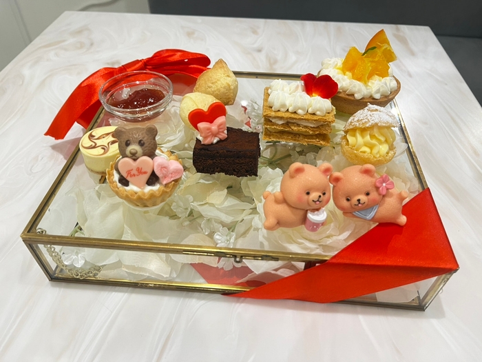 アフタヌーンティーのデザートを使っているのでバレンタイン仕様のプレートなっております。