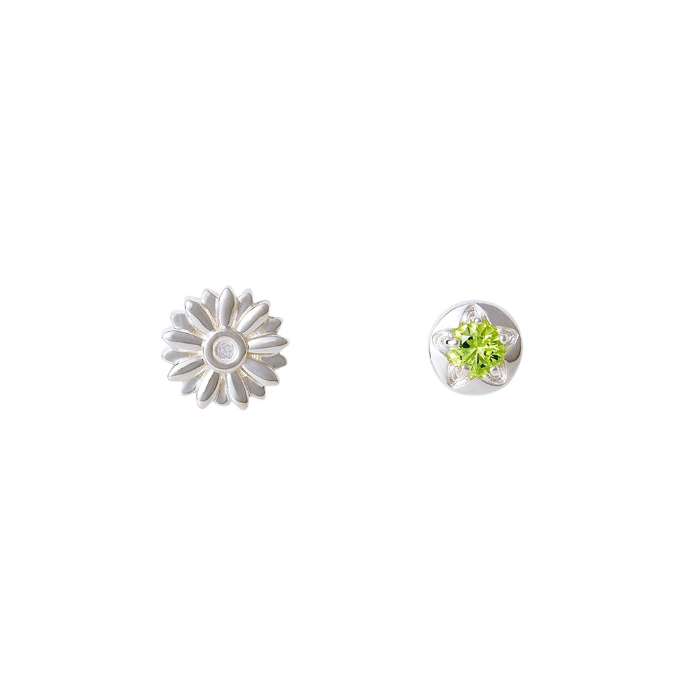 片方はデイジーの花のモチーフ、もう一方はイメージカラーストーンをセットした一粒タイプのアシンメトリーなデザイン。