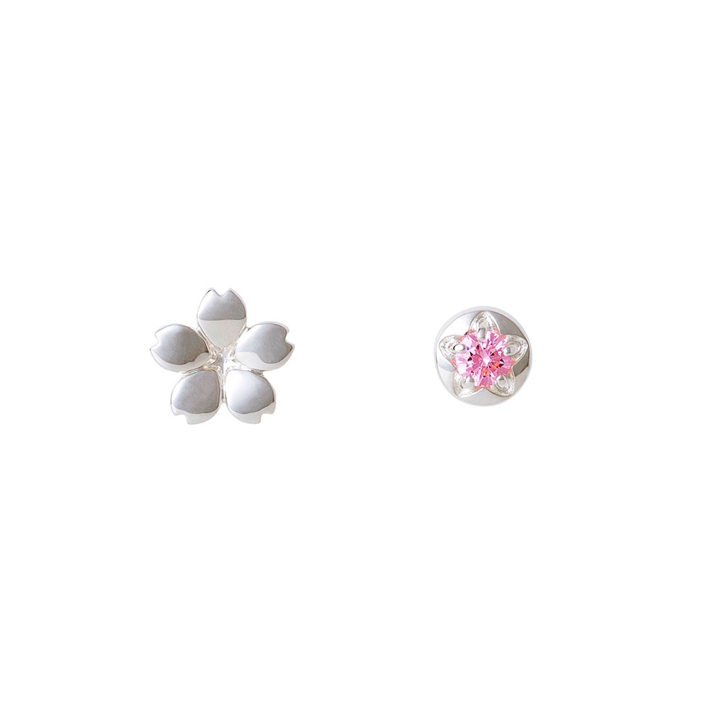 片方は桜の花のモチーフ、もう一方はイメージカラーストーンをセットした一粒タイプのアシンメトリーなデザイン。