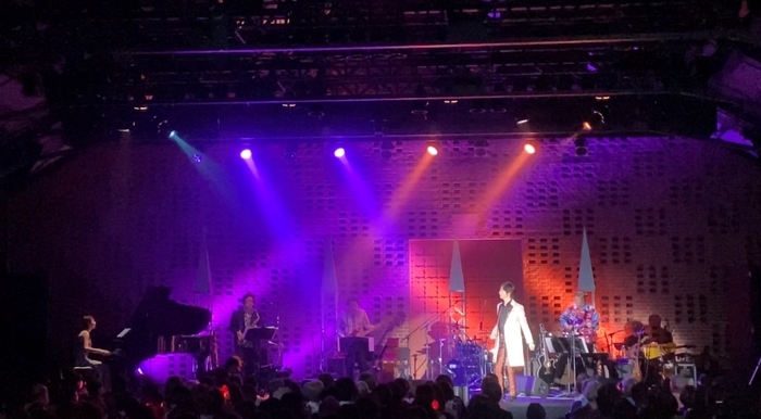 後半は、鮮やかな黄緑のジャケットに着替えて登場。ギターの演奏のみで長谷川きよしの『別れのサンバ』、オリジナル曲『くちなしの雨』を歌唱し、ムーディーなステージを作り上げた。そして、リズムに合わせて体を揺らしながら『愛の嵐』、越路吹雪の『愛の讃歌』を歌唱。高らかに歌う竹島の姿に、たまらずファンからは歓声が上がった。