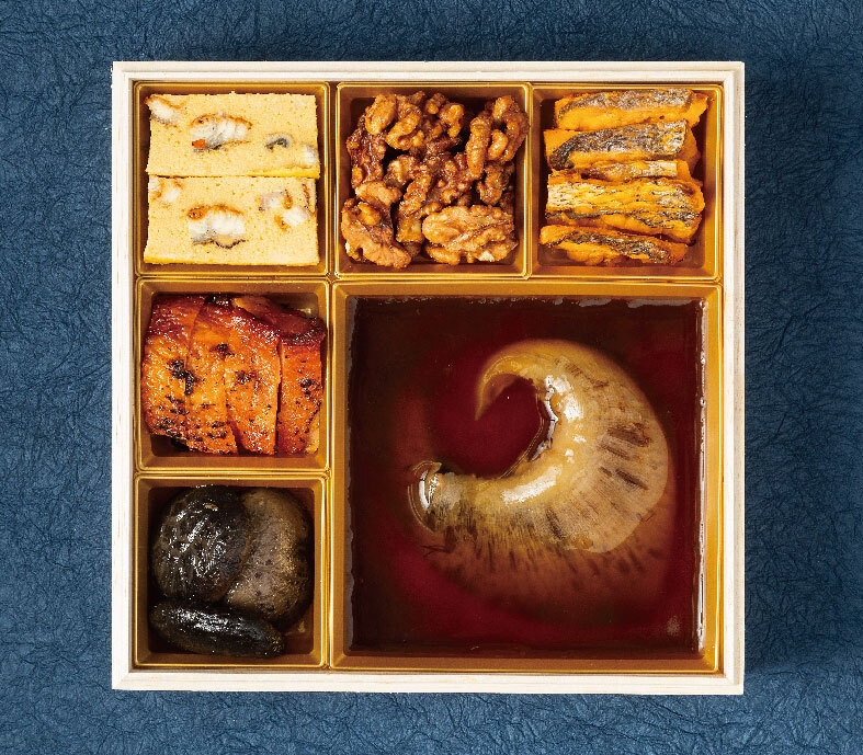 うまや自慢の“みつせ鶏の串焼き”や高級食材“宮崎産キャビア”をはじめ、九州の郷土料理や食材がたくさん詰まった、和みとおもてなしのおせちです。
