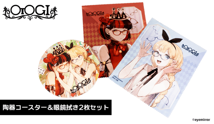 toi8先生描き下ろしの<メインビジュアル>を使用した陶器コースターと、「アリスのイラスト」の眼鏡拭き、「ハートの女王のイラスト」の眼鏡拭き2枚をセットにしました。