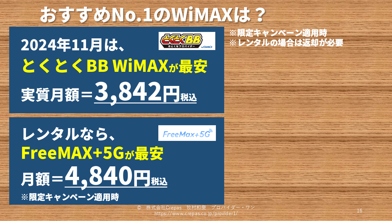 ※当ページの画像は2024年11月時点のものですが、今月についても最安は「とくとくBB WiMAX+5G」となっています。