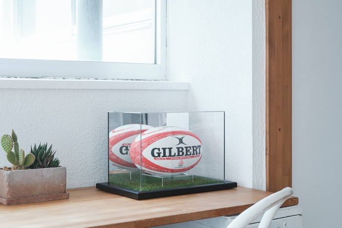 ラグビーボール、アメフトボール、ゴルフボールなどボールの大きさに合わせたサイズ設計を施しており、美しく飾れる専用ケース。