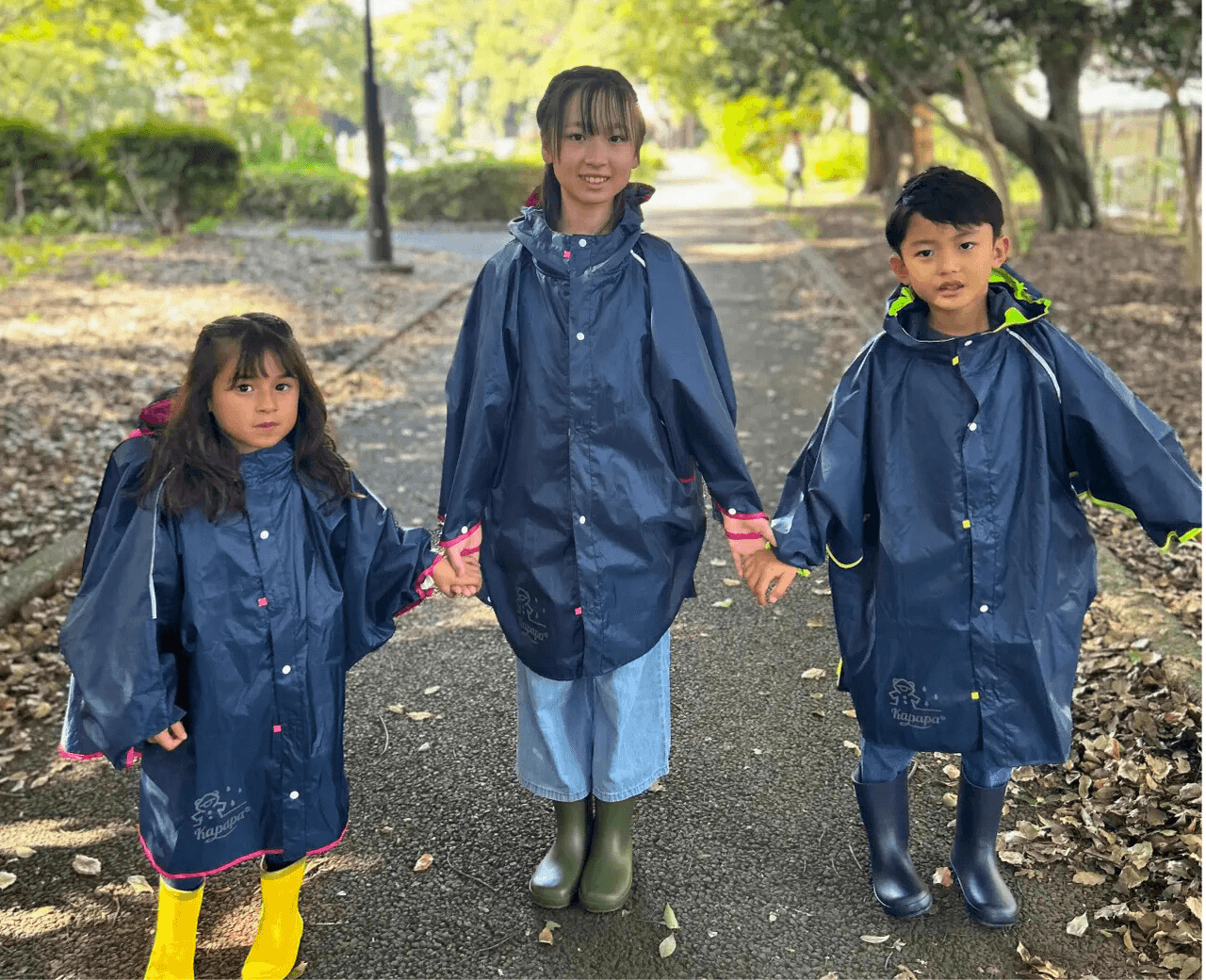 代表の和田美香は、自らの子どもが雨の日の通学でぬれてしまうのを目の当たりにし、「親として、保育士としても、子ども達を守りたい」という想いを込めて本製品を開発しました。