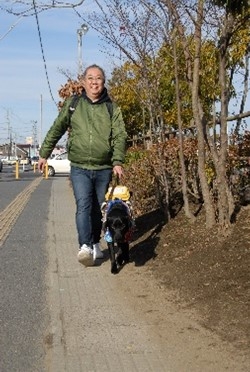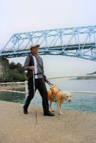 盲導犬ユーザーになったのは? 白杖歩行訓練で行った施設で、盲導犬の体験歩行が行われることを知って、実際にやってみて納得し、昨年、呉市で最初のユーザーになったのです。