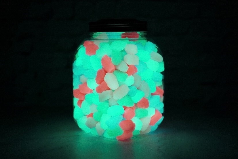 従来、市販の蓄光プラスチックでは白色の蓄光プラスチックは白色の顔料が光を遮ってしまうため、製造が技術的に困難であるとされておりましたが、クリスマスイベント用の開発した白色蓄光プラスチックは顔料の選定から配合率、当社独自の配合方法により、今まで不可能とされていた白色でも高い蓄光輝度で幻想的に輝かせる新技術を開発しました。