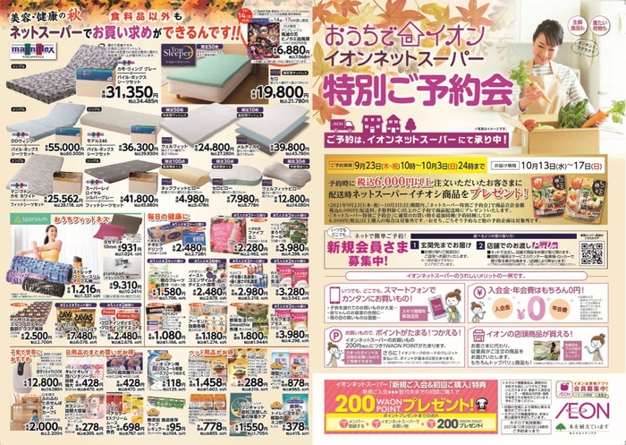 イオンリテール㈱東海カンパニーは、9月23日(木・祝)~10月3日(日)の期間、愛知・岐阜・三重・静岡県内の「おうちでイオン イオンネットスーパー」対象店舗にて、【秋の味覚 旬のごちそう予約会】を実施します。