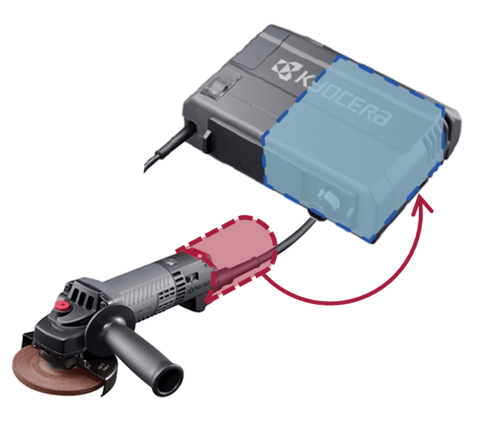 工具本体からブラシレスモーターを制御する回路部を切り離した、コントローラーに格納する新発想のシステムより、従来金属加工の現場で使われていた電動工具やエア工具に比べ、質量、出力、耐久性において優位性を実現しました。200Vの電動工具や御回路を工具から分離大型エアコンプレッサーに対しては、消費電力を削減することが可能です。