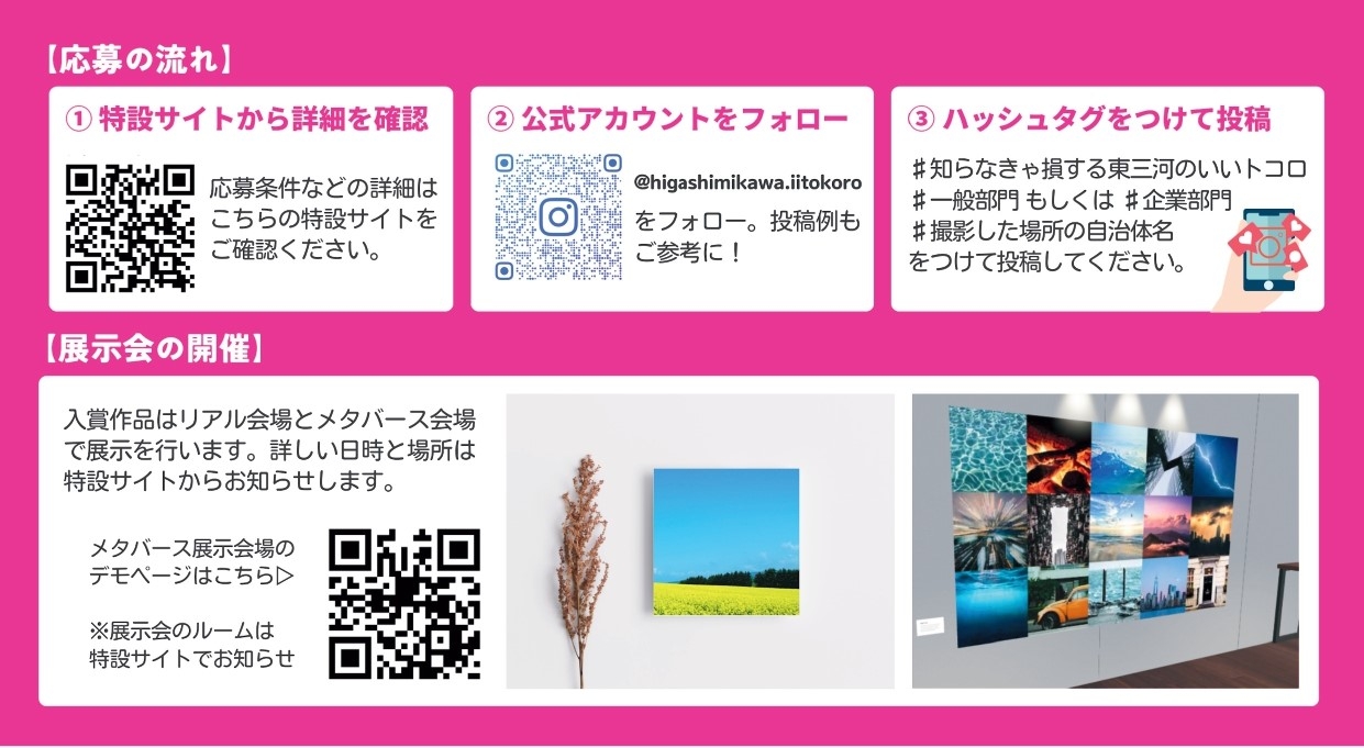 テーマを「I♡東三河~知らなきゃ損する東三河のいいトコロ」とし、プロ・アマ問わず、一般部門・企業部門に分けて写真を公募。現地に住んでいる方だからこそ知っている、愛知県豊橋市東三河地域のおすすめスポットや秘密の場所、知る人ぞ知るグルメなど、地域の魅力を参加者同士でシェアしあいながら楽しみながら発信していくイベントです。受賞作はメタバース空間での展示会を行います。