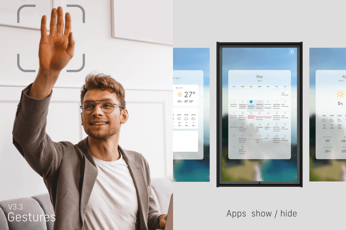 ジェスチャーは、「右手を上げる」と「左手を上げる」の2種類。選べる指定の操作は、「風景の切り替え」「スリープモード」「カレンダー表示」など10種類にわたり、ユーザーの生活スタイルに合わせて自由にカスタマイズができます。外出前の忙しい時間や、就寝前などにリモコンやスマートフォンなしで気軽に操作ができます。