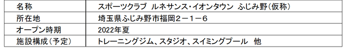 株式会社ルネサンス(本社:東京都墨田区、代表取締役社長執行役員:岡本利治、以下「当社」)は、「スポーツクラブ ルネサンス・イオンタウン ふじみ野(仮称)」を2022年夏に出店することといたしましたので、以下の通りお知らせいたします。