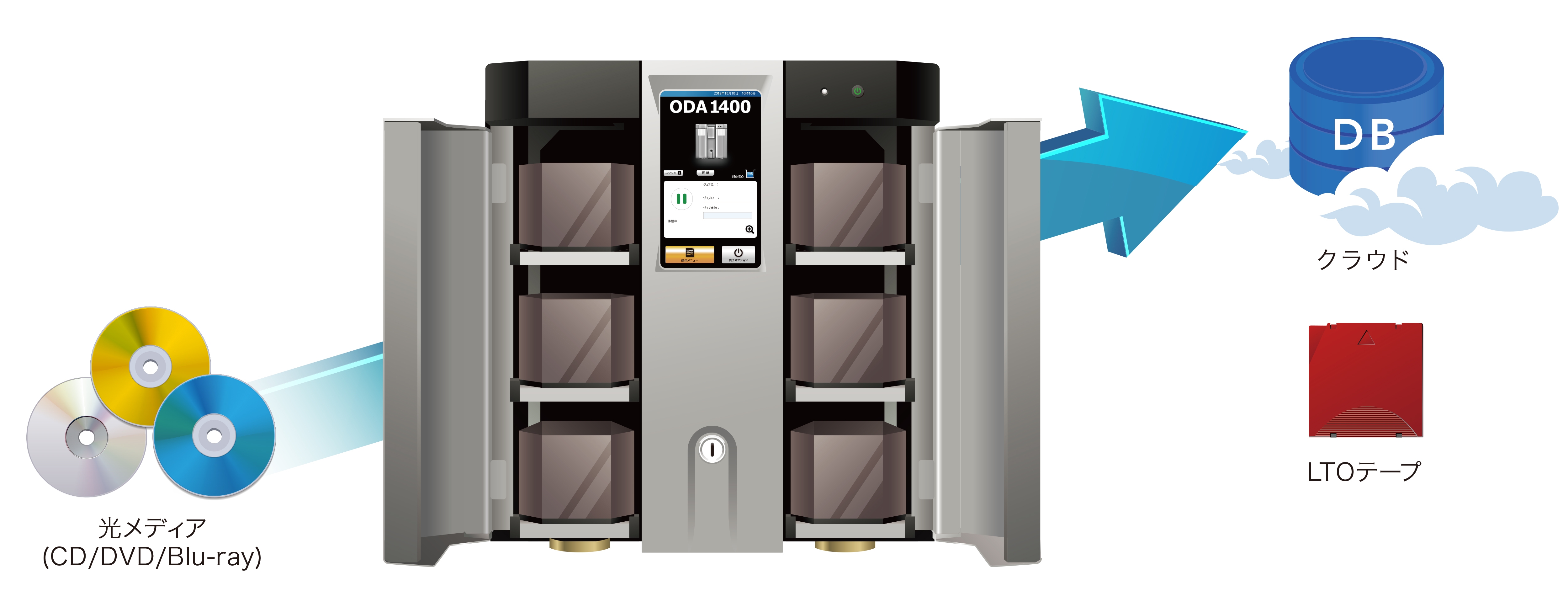 「ODA1400 光メディアデータ資産アーカイブシステム」は大量光メディアデータを自動集約・メタデータ化しデータ資産一元管理・保管スペース大幅削減・データ利活用時の検索を飛躍的に容易にします。大量光メディア過去データ資産対応に最適なデータストレージソリューションです。