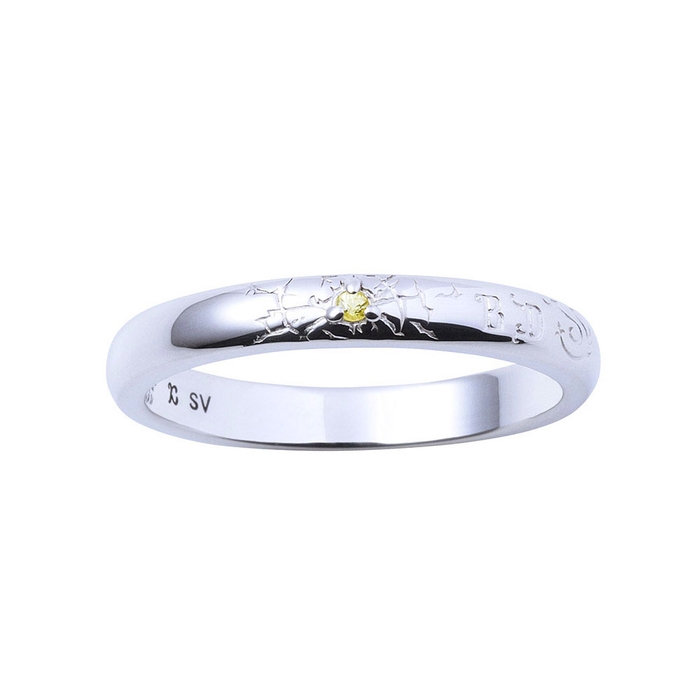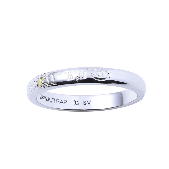 甲丸フォルムのリングに弾痕と黒龍のモチーフを取り込み、イメージカラーのイエローサファイヤをセット。内側には「黒龍」を黒塗装で刻印しました。