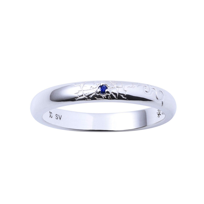 甲丸フォルムのリングに弾痕と髪の毛の剃り込みを取り込み、イメージカラーのサファイアをセット。内側には「東京卍會」を黒塗装で刻印しました。