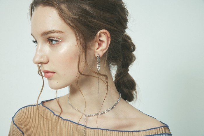 フロントの存在感のあるチェーンと、バックの繊細なロングチェーンが絶妙なバランスを生むダブルチェーンピアス。フォーマルからカジュアルまで。