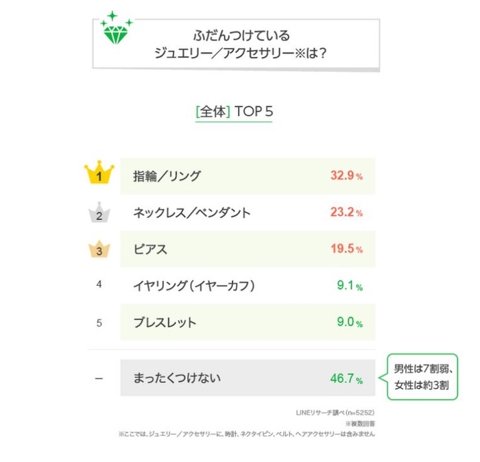 指輪の着用率が高いのは、認識されているところですが、ネックレスやピアスも約2割。