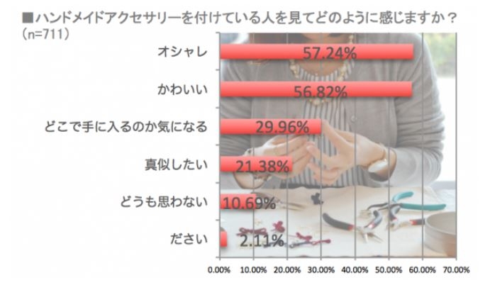 少し以前の調査結果ですが、この表をみると、ハンドメイドに「個性」を求めている心理が垣間見えます。たとえ、ブランド品であっても、大量生産のアクセサリーではもはや満足できない人が増えているといえます。そんな中で、「自分だけのオンリーワン」こそが気分を上げてくれる、というわけなのでしょう。また、ハンドメイドの場合は、アレルギーへの対応がしやすいというメリットも人気の理由にあがっていました。