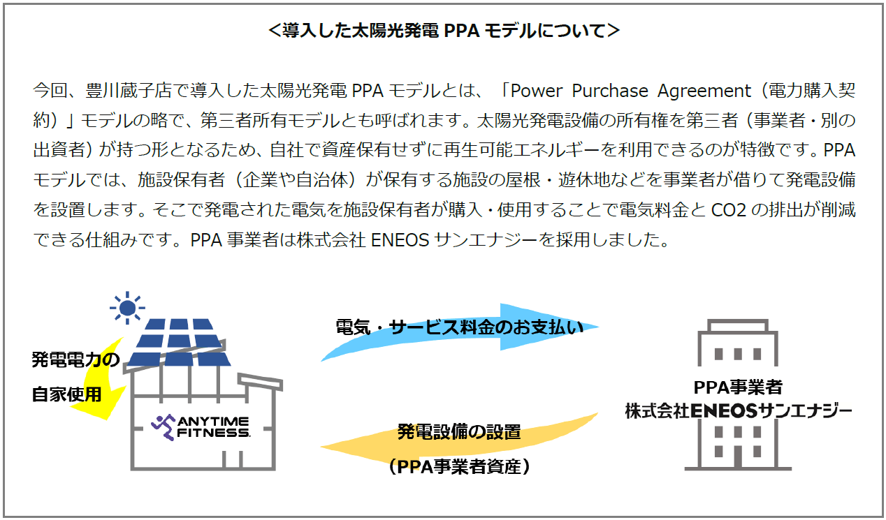 24時間年中無休フィットネスジム「ANYTIME FITNESS(エニタイムフィットネス)」の国内マスターフランチャイジーとして全国で直営店舗の運営及びフランチャイズ展開を行う株式会社Fast Fitness Japan(本社:東京都新宿区 代表取締役社長:山部清明)は、グリーン電力利用の推進に向けた試験的な取り組みとして、直営店である豊川蔵子店(愛知県豊川市)に太陽光パネルを設置し、店舗でのグリーン電力の利用を開始いたしました。