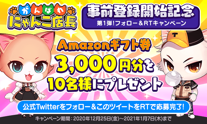 2020年12月25日(金)から、公式Twitter(https://twitter.com/ganbarenyan)より、「第1弾!フォロー&RTキャンペーン」を2021年1月7日(木)まで実施いたします。