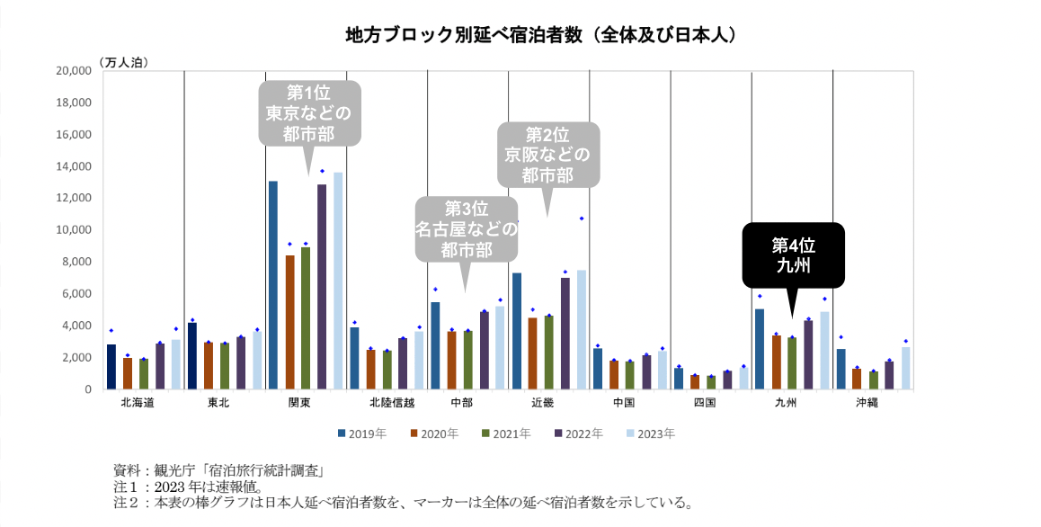 しかし、いまだ旅行先で人気なのは東京・大阪・京都・名古屋などの大都市を有する関東・近畿・中部ブロックです。一方、それ以外の地域に視野を広げると、次に九州が国内旅行者・外国人旅行者ともに人気が高いことが、観光白書の調査結果から見てとれます。