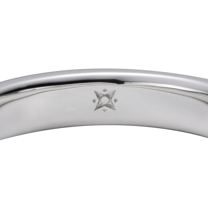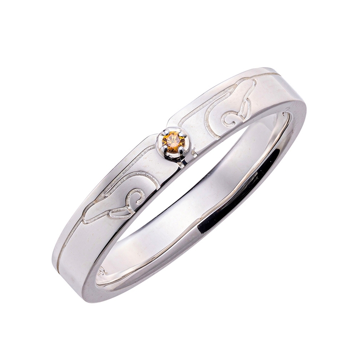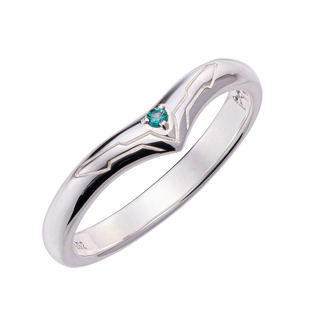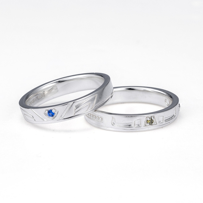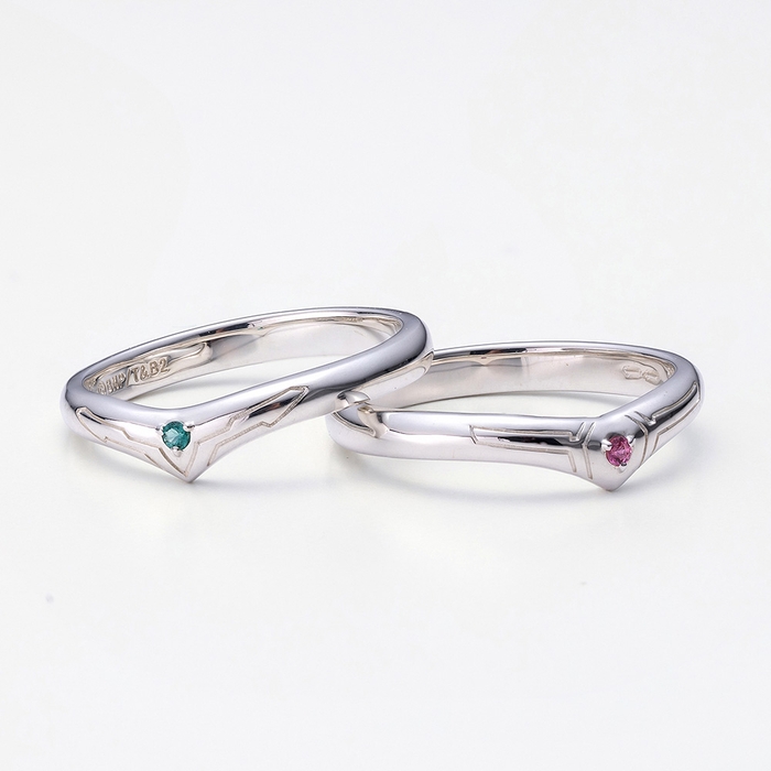 イメージカラーストーンをセットした甲丸フォルムの表面には、スーツの背中のモチーフを取り込み、内側には雪の結晶の形を刻印を施しました。