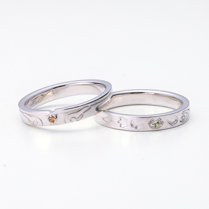 スーツの胸元の模様を取り込んだなめらかな平打ちフォルムの表面にイメージカラーストーンをセット。内側にはジョンとジョンジョンの足跡の形を刻印しました。